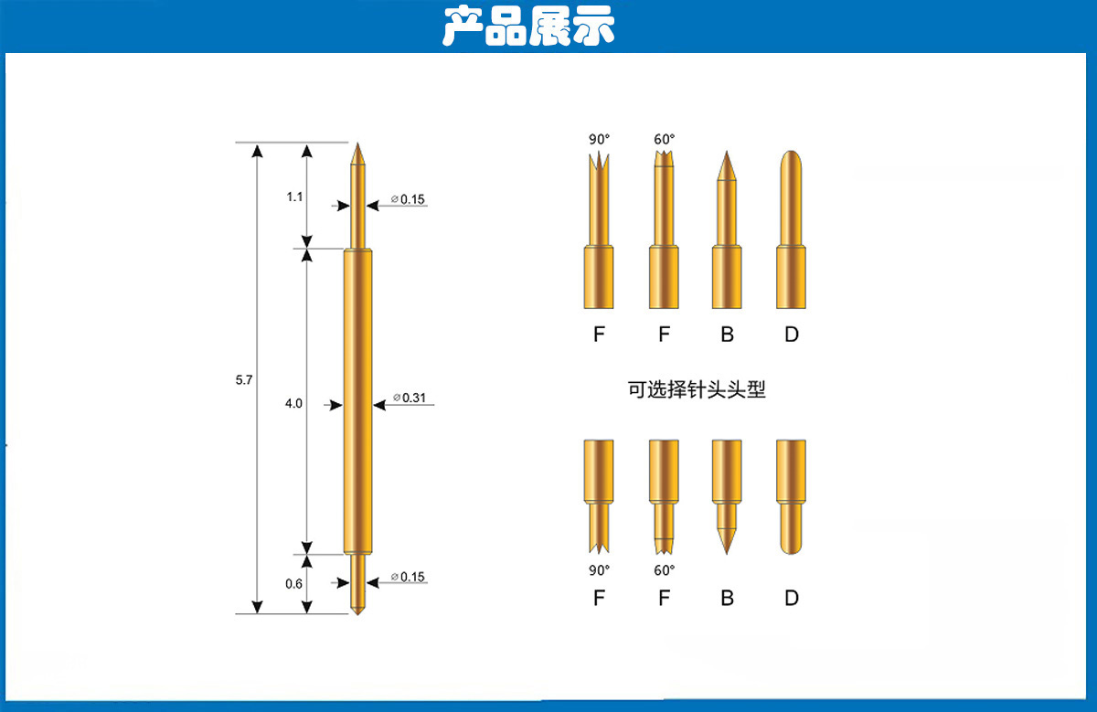 產(chǎn)品頭型:探針外徑為0.31mm,總長(zhǎng)度為5.7mm、針的兩端的頭型分為爪頭