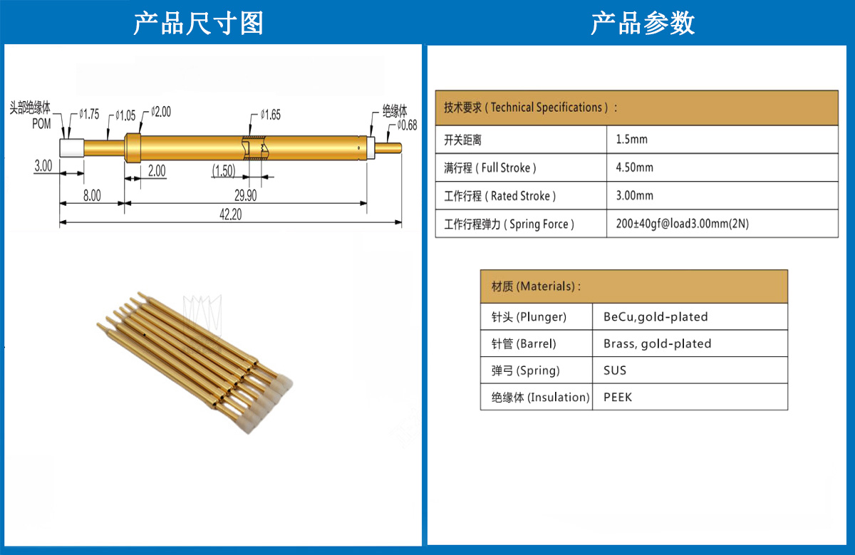 產(chǎn)品簡介:KGZ165探針、1.65mm測試針、總長42.20mm、彈簧針、測試針